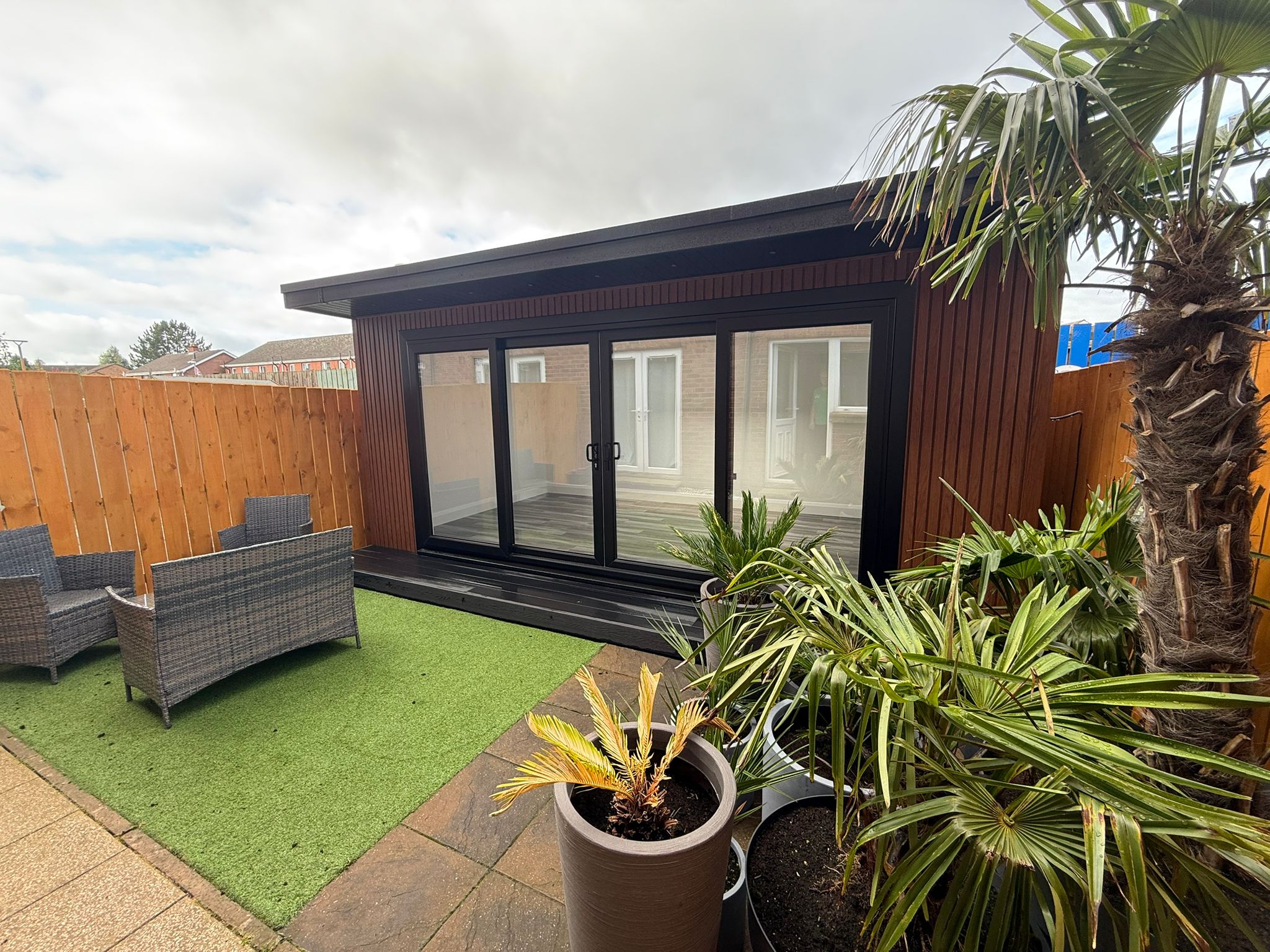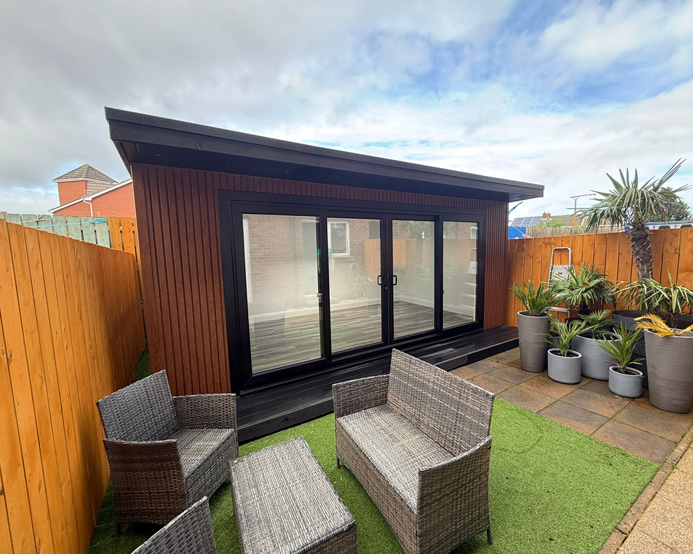 Ahead in Sheds has delivered a bespoke garden room in Belfast, built with our stylish walnut brown cladding for a modern, durable finish. Black PVC windows and doors elevate the design, creating a high-quality, low-maintenance garden office space. This turnkey garden room adds value, comfort and year-round usability to any home.